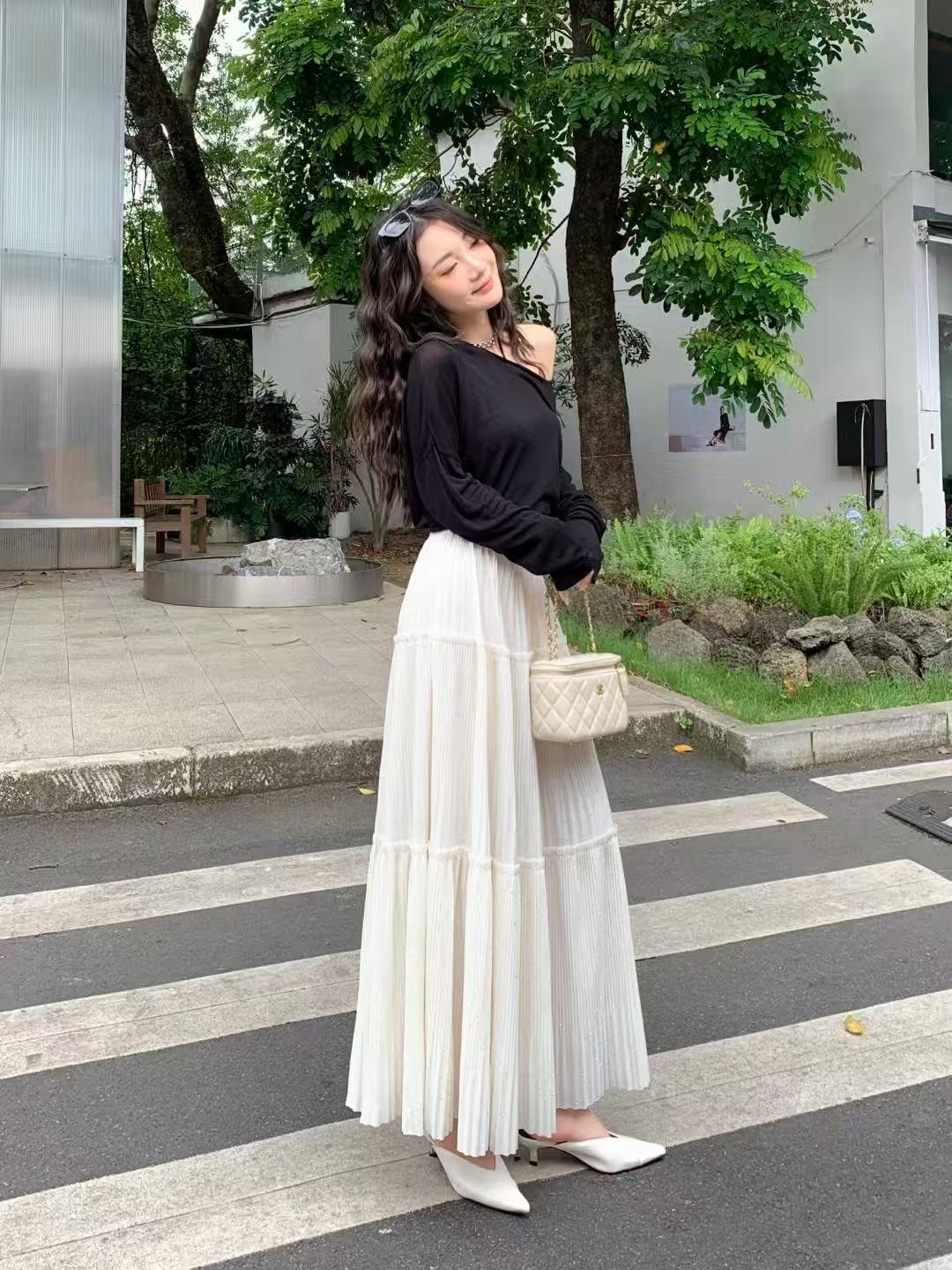ドット柄がフェミニンなマキシスカートと、ゆるふわニットセーターのセット。トレンド感あふれるコーディネートを簡単に実現。CKBなら、高品質な商品を低価格で仕入れ可能!