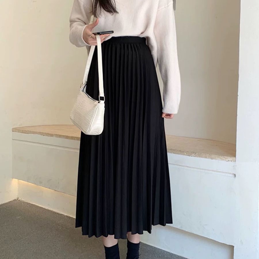 ブラックプリーツスカート Aラインスカート レディースミドル丈ハイウエストスリミングスカート
