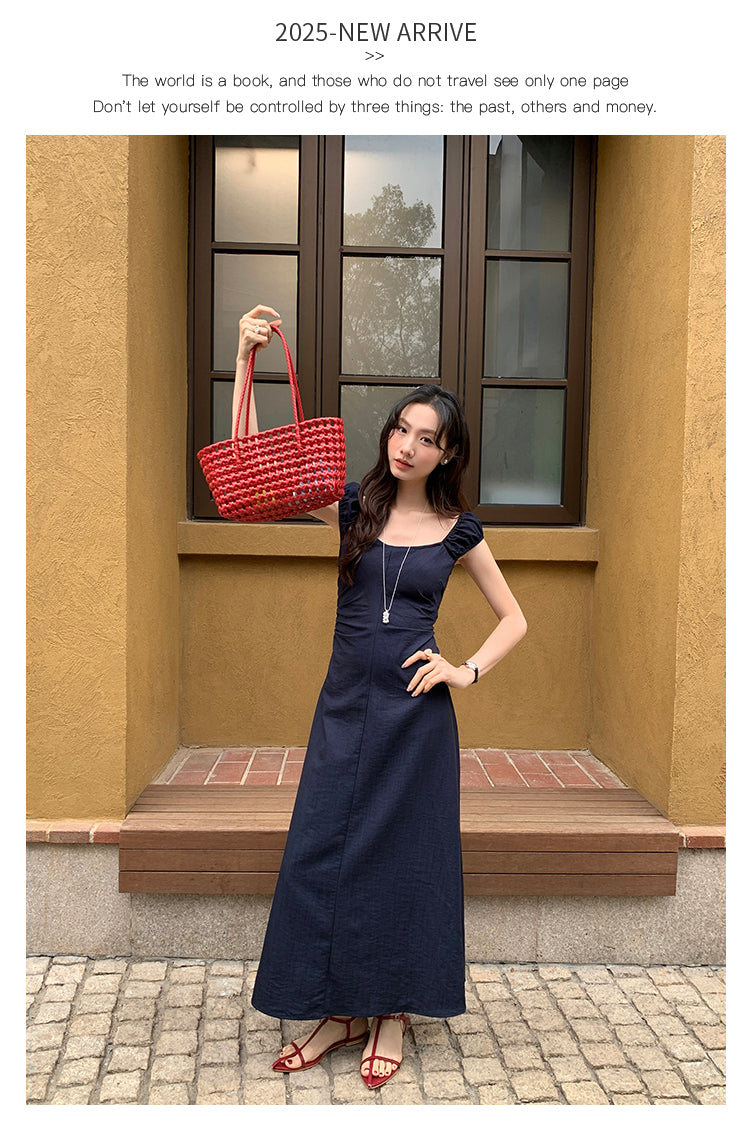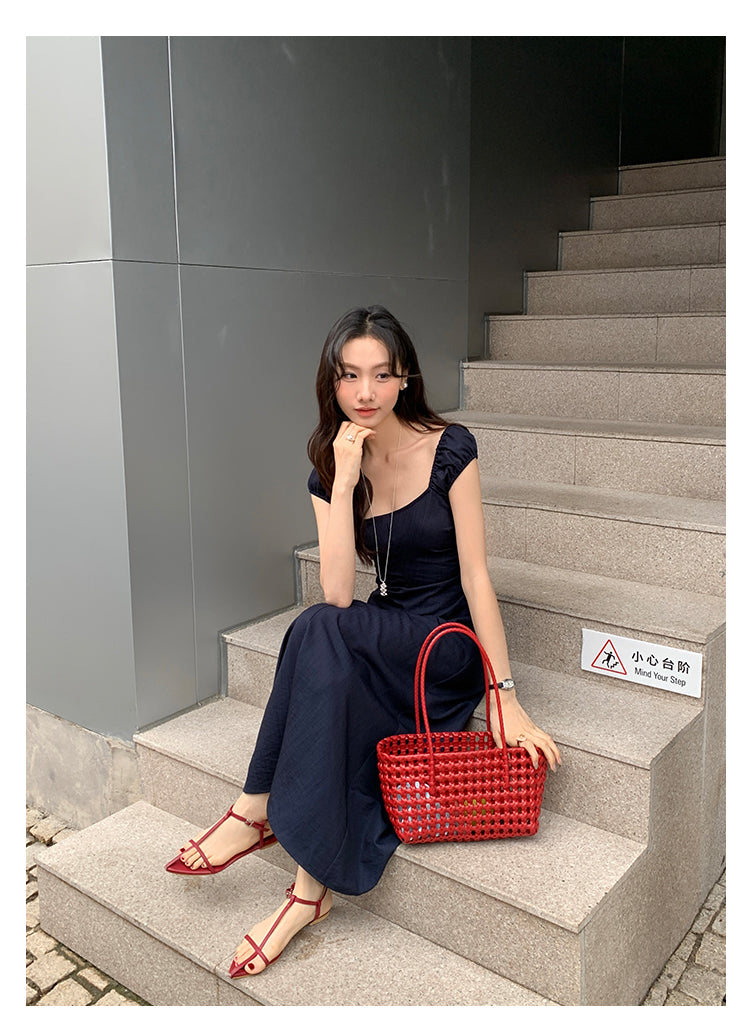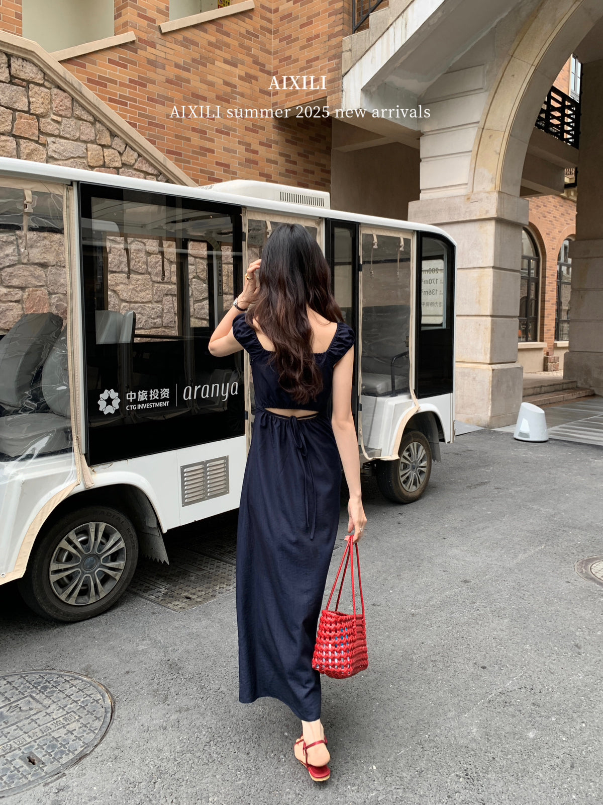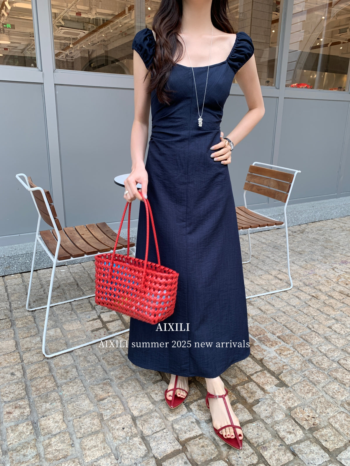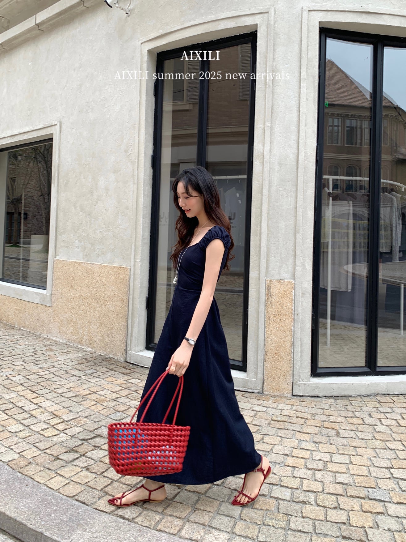AIXILI 2025年夏の新着アイテム、スクエアネックワンピースです。洗練されたデザインと落ち着いたカラーで、大人可愛いフェミニンスタイルを演出します。カジュアルなシーンにも最適で、快適な着心地を提供します。レッドのバッグとサンダルでファッションセンスを高めます。