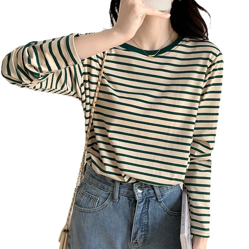 コットン素材 ストライプ 長袖Tシャツ レディース インナーウェア 丸首 カジュアル トップス